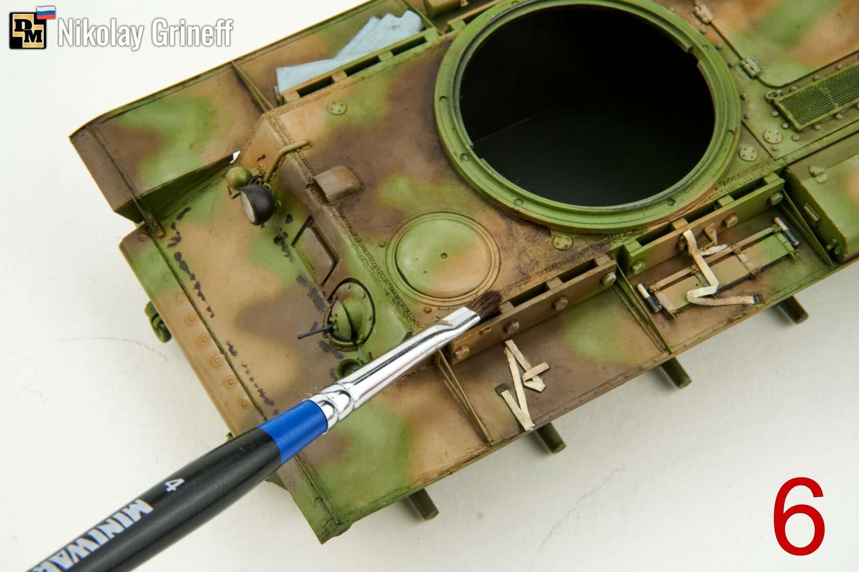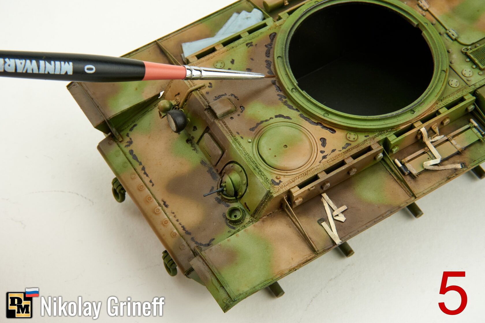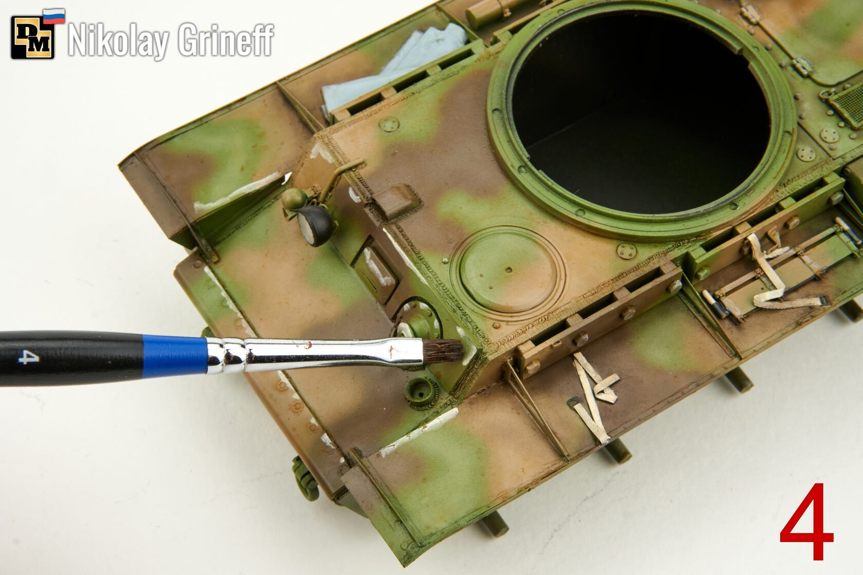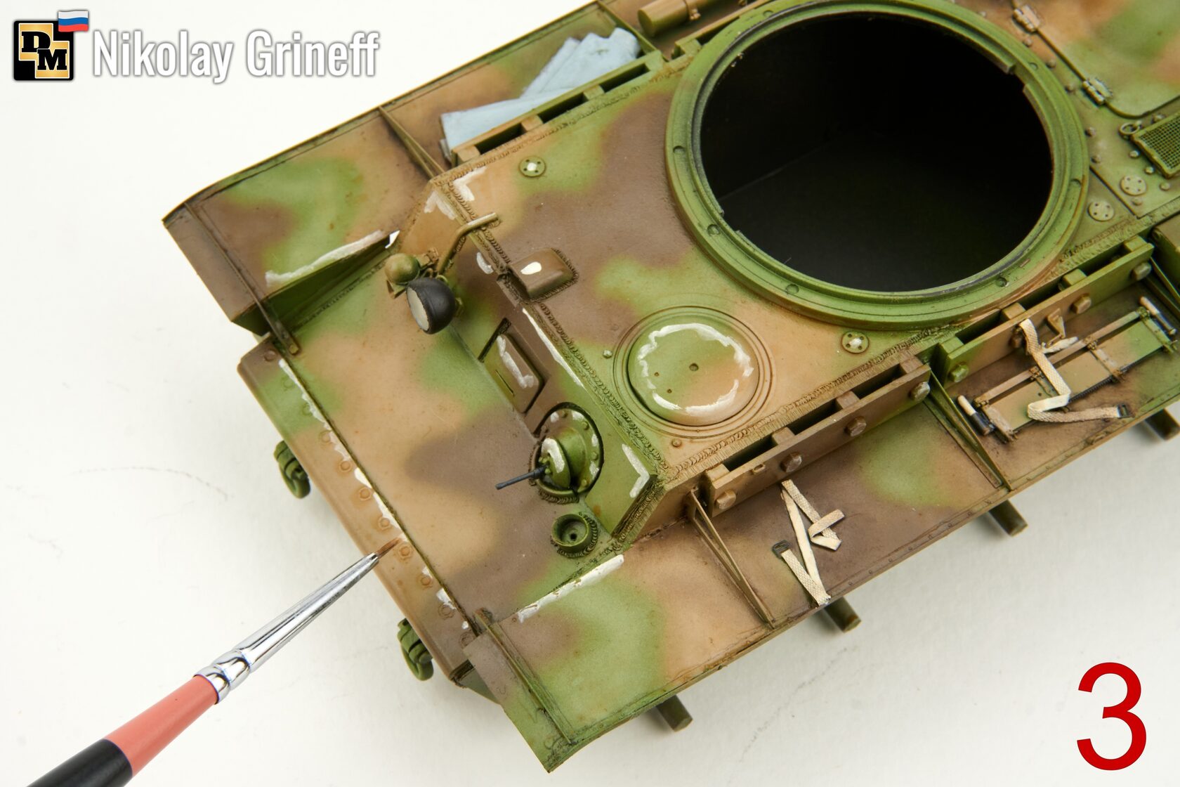 3. Идем от светлого. Берем масло от Хася Моделист. Нам нужен теплый светлый бежевый оттенок, в данном случае это Охра Светлая/Light Buff. Наносим масло на выступающие детали и углы плоскостей показанным на фото способом;